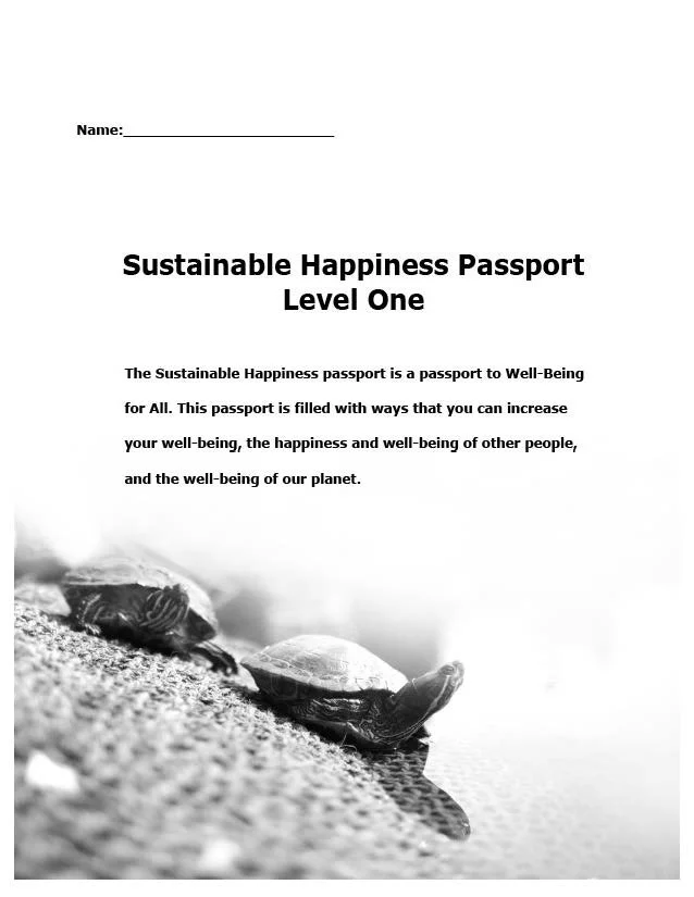 Download a black white Sustainable Happiness passport designed to teach young ones about Sustainable Happiness in a camp setting